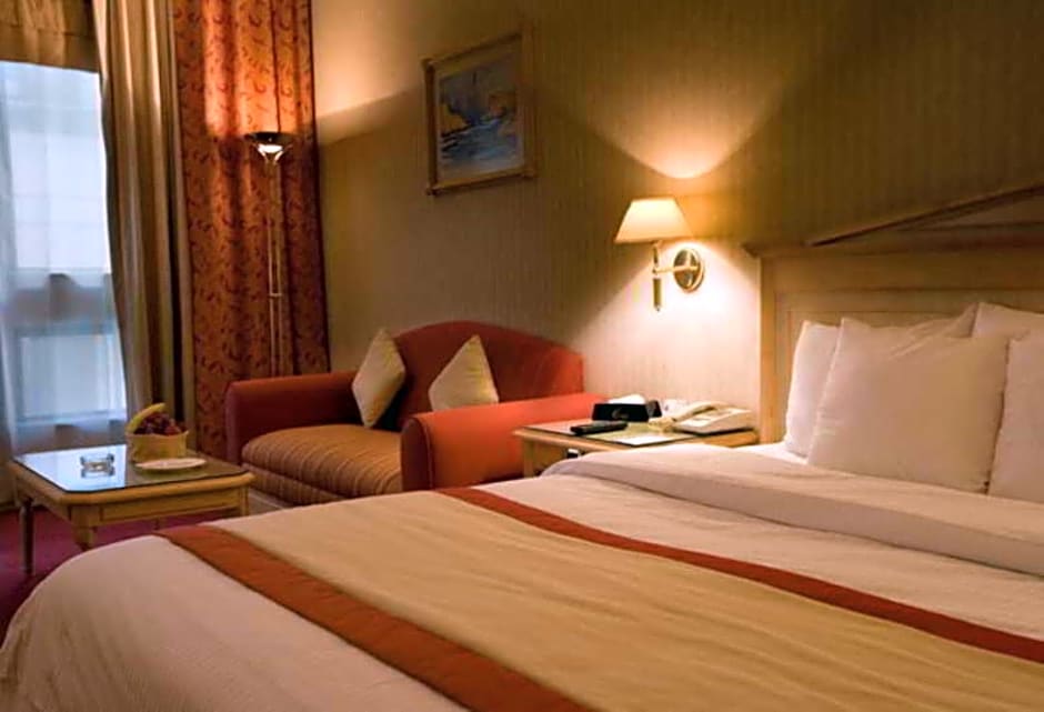 Decorated with light gold wallpaper and wooden furniture, this large room comes with a work desk and LCD TV.